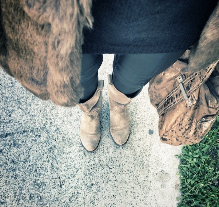 Hoy ha tocado darle un toque bohemio a mi conjunto del día combinándolo con un abrigo de pelo sintético en color marrón, un jersey XL y calentito de lana, y unos pantalones de piel negros.